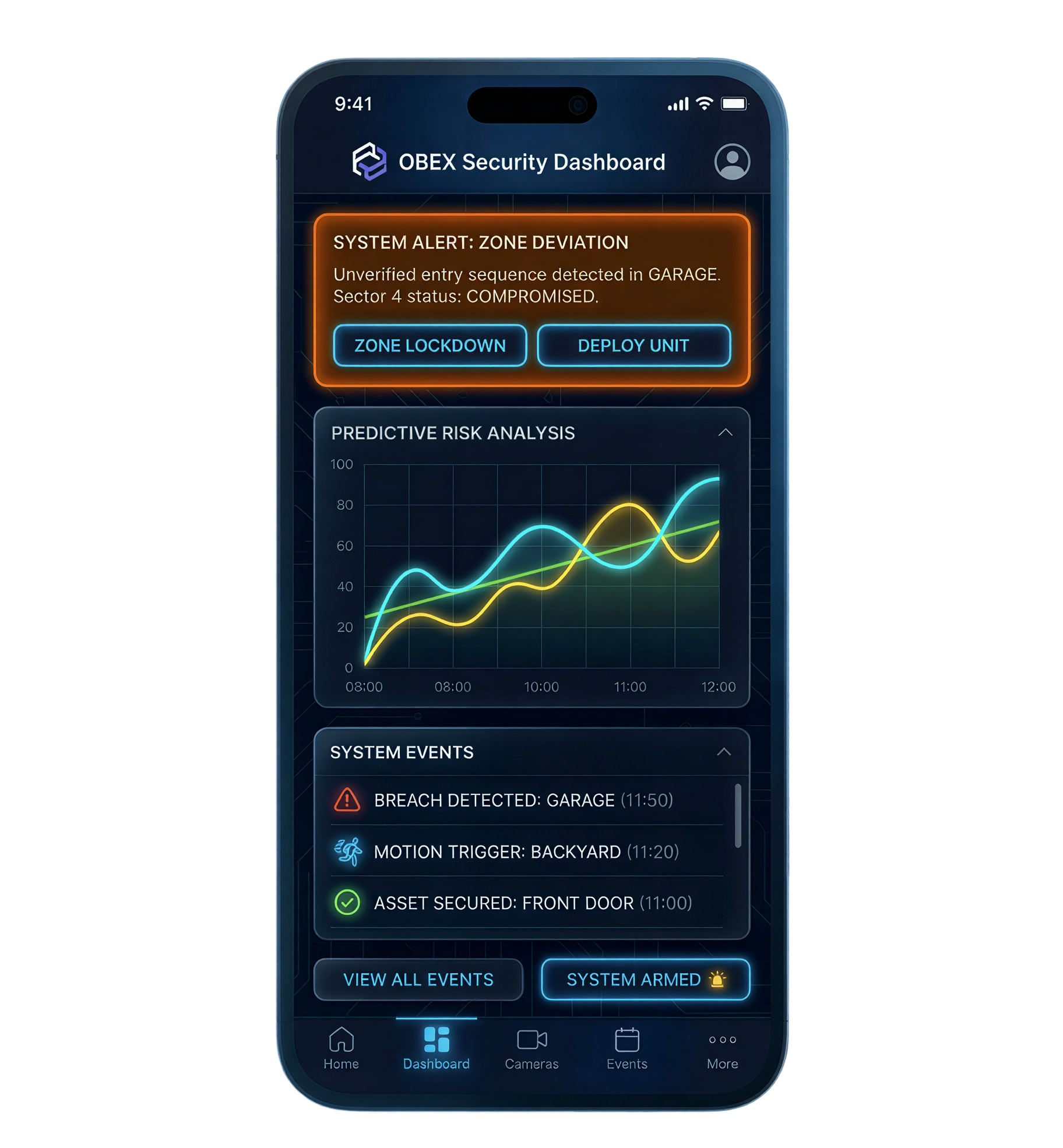 The Obex interface transforms passive monitoring into active command. Your entire estate's security matrix is unified on this screen, granting you immediate, sovereign control without reliance on external networks.
